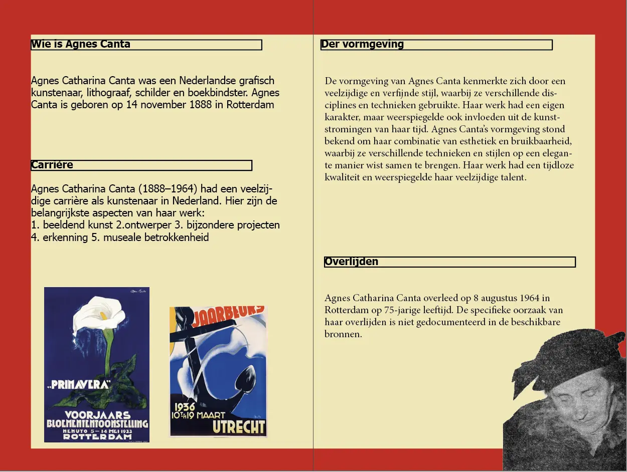 Met adobe illustrator heb ik een magazine gemaakt over Agnes Canta, dit heb ik in mijn eerste jaar voor het eerst gemaakt. Om deze magazine te maken heb ik plaatjes gebruikt te maken met Agnes Canta, en bij het plaatje waar Agnes Canta zelf op staat heb ik de achtergrond verwijderd door middel van photoshop.